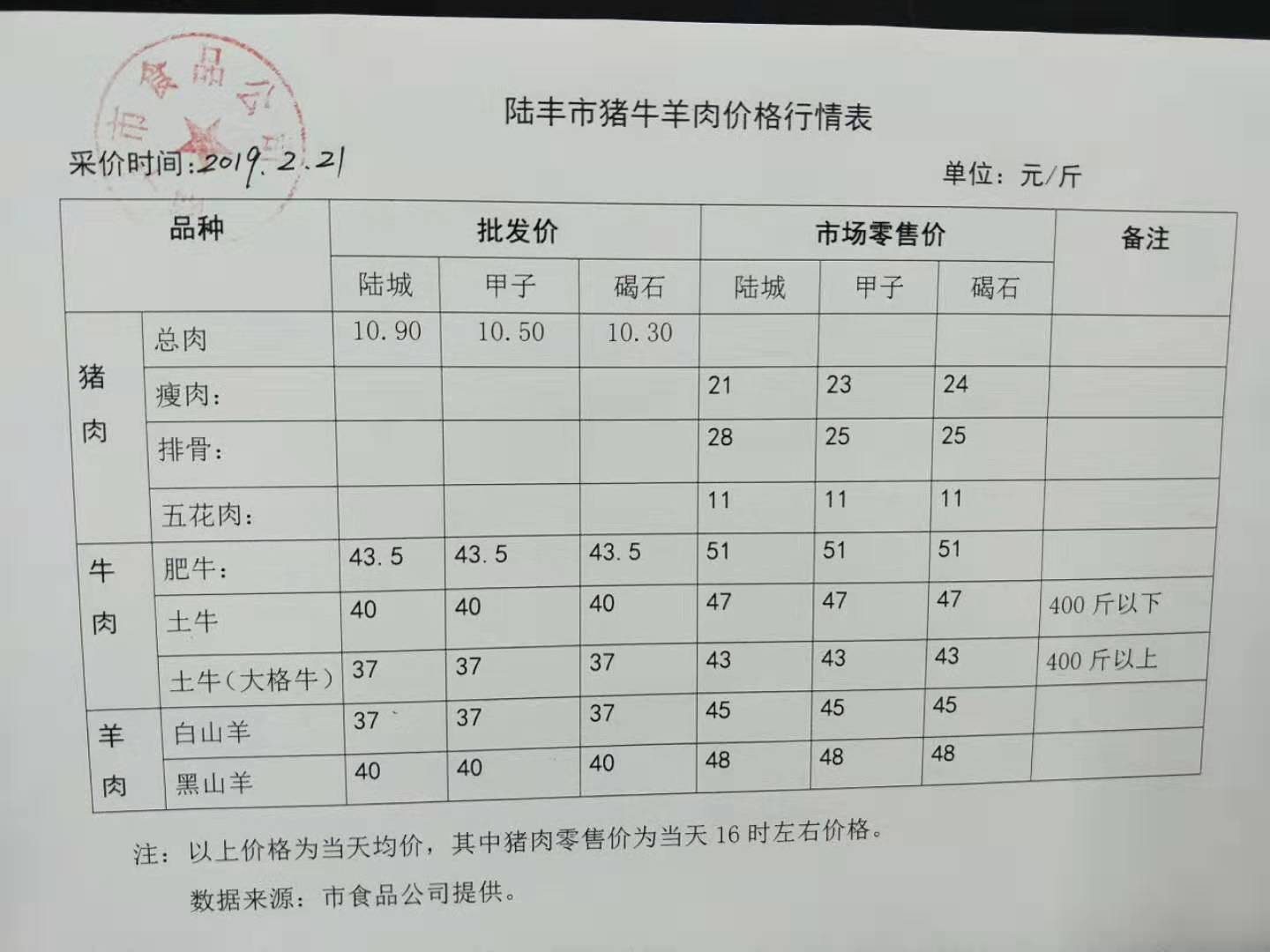 陆丰市猪牛羊肉价格行情表(2019年2月21日)