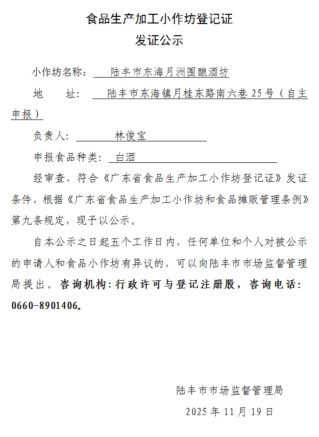 食品生产加工小作坊登记证发证公示