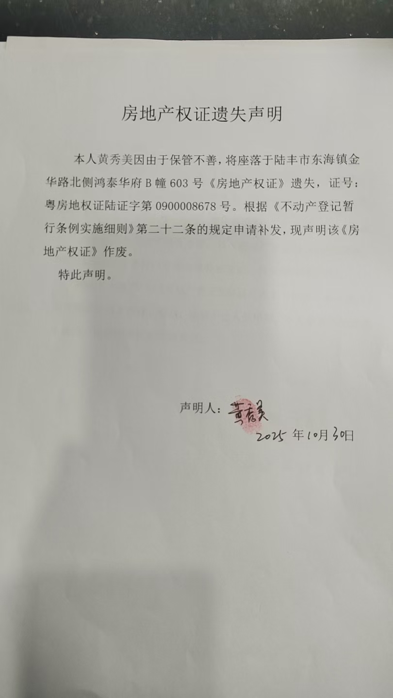 遗失声明:本人黄秀美因由于保管不善,将座落于陆丰市东海镇金华路北侧鸿泰华府B幢603号《房地产权证》遗失,证号:粤房地权证陆证字第0900008678号。根据《不动产登记暂行条例实施细则》第二十二条的规定申请补发,现声明该《房地产权证》作废。