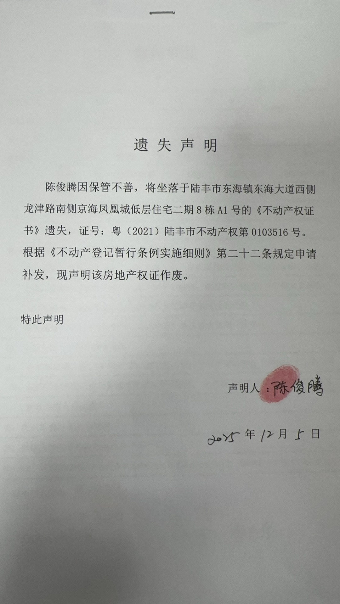 陈俊腾因《不动产权证书》遗失,现向我局申请补发新权属证书,根据《不动产登记暂行条例实施细则》第二十三条的规定,对下列房地产权证公告作废。