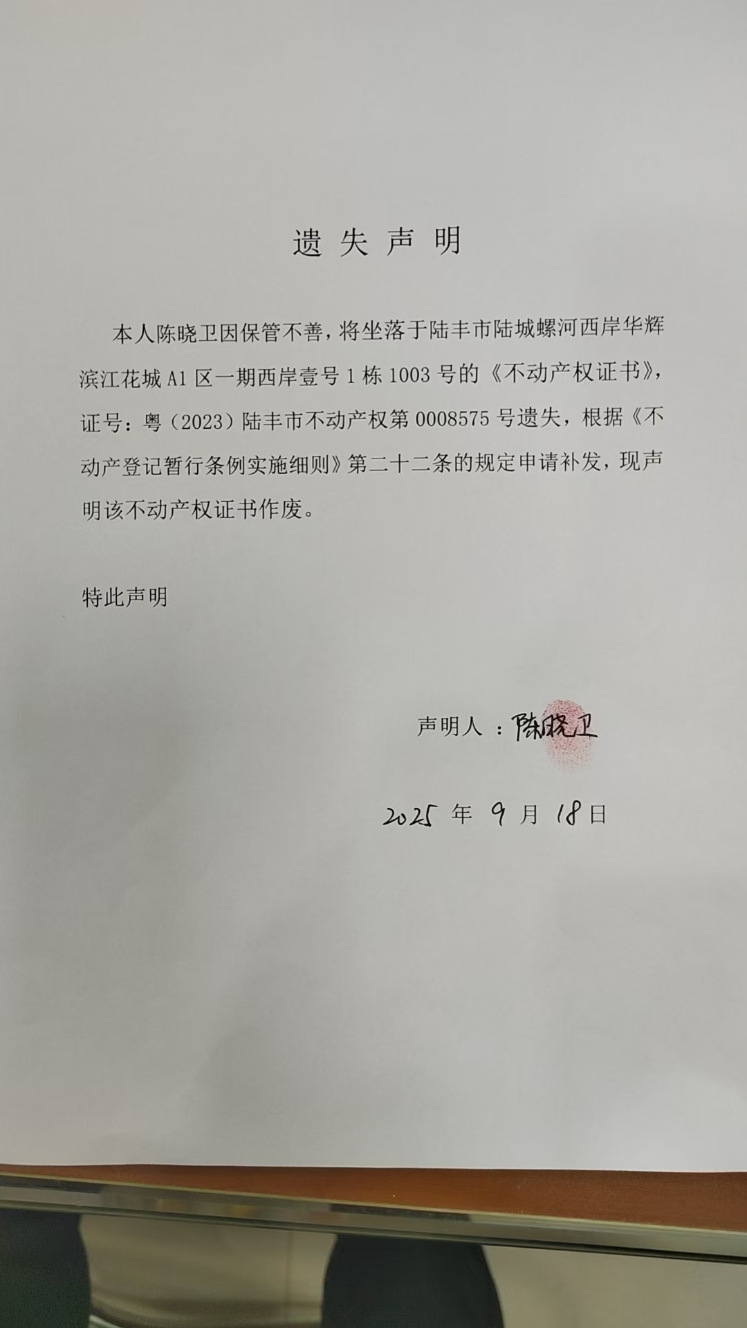 本人陈晓卫因保管不善,将坐落于陆丰市陆城螺河西岸华辉滨江花城A1区一期西岸壹号1栋1003号的《不动产权证书》,证号:粤(2023)陆丰市不动产权第0008575号遗失,根据《不动产登记暂行条例实施细则》第二十二条的规定申请补发,现声明该不动产权证书作废。