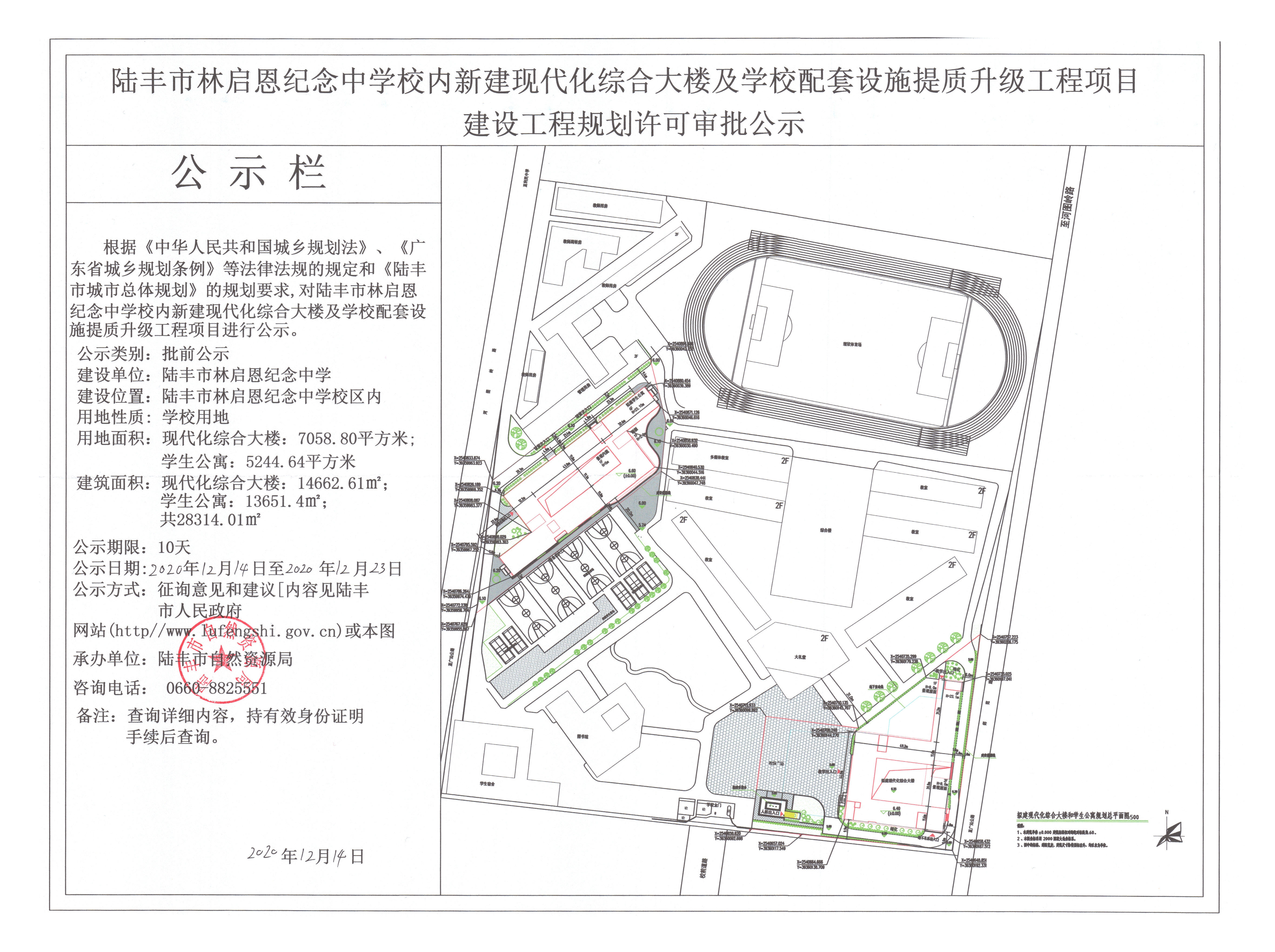 陆丰市林启恩纪念中学校内新建现代化综合大楼及学校配备设施提质升级工程项目建设工程规划许可审批公示