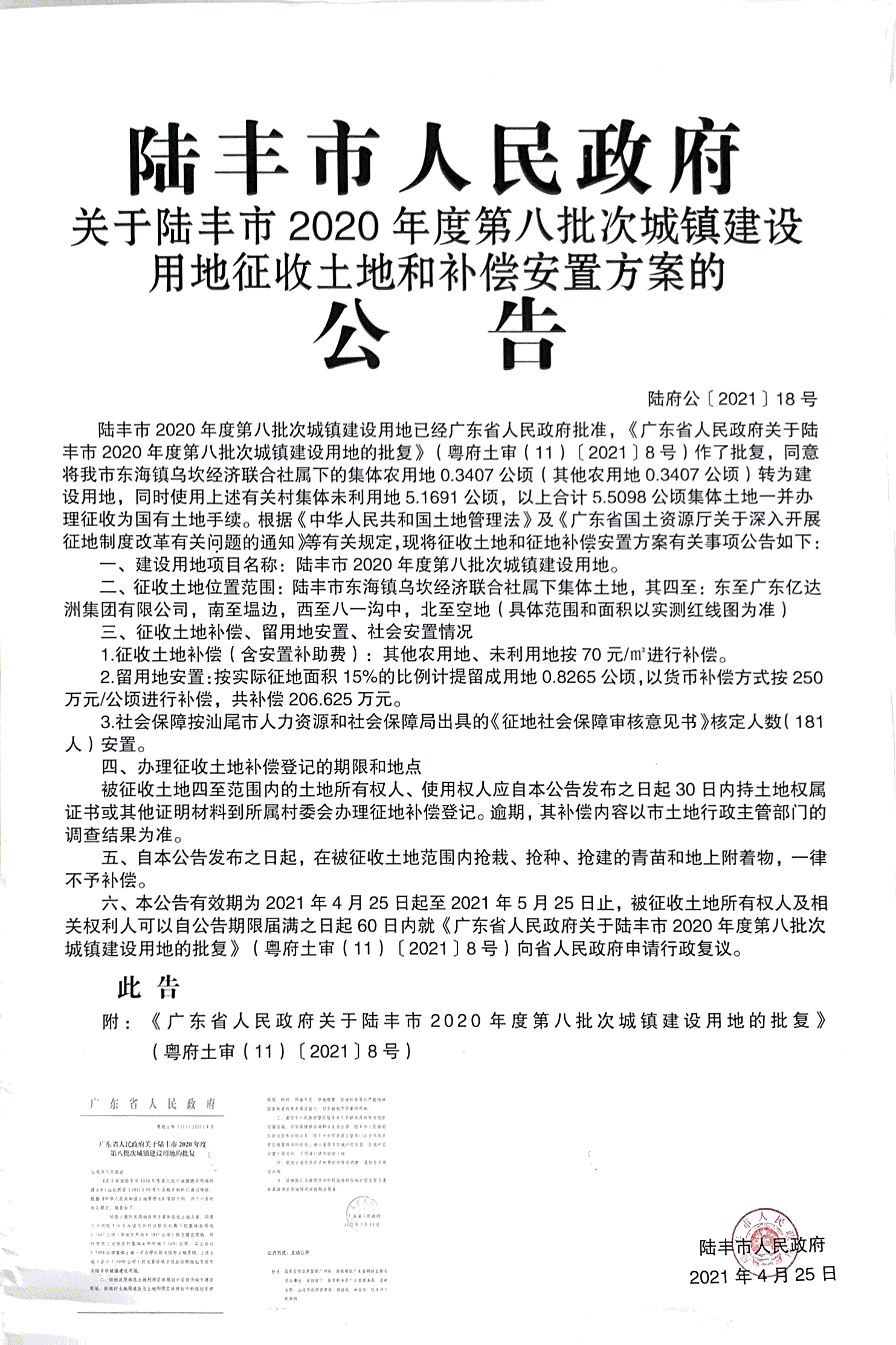 广东省人民政府关于陆丰市2020年度第八批次城镇建设用地的批复(粤府土审(11)〔2021〕8号)