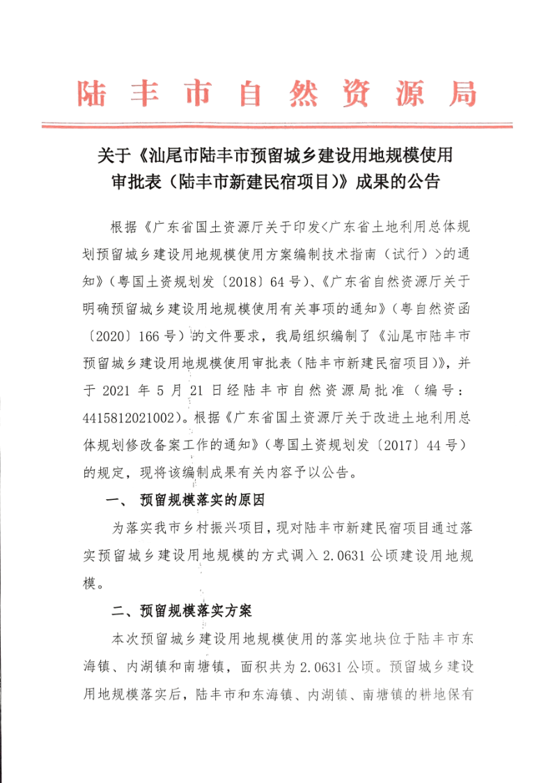 关于《汕尾市陆丰市预留城乡建设用地规模使用审批表(陆丰市新建民宿项目)》成果的公告