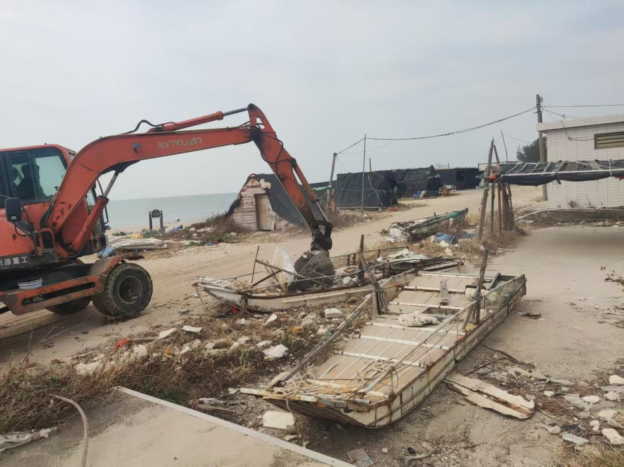 本次行动组织镇经济发展办公室、综合行政执法队职工及各村抽调的网格员共计20人,于洲渚村草寮区域开展全面排查。行动聚焦隐蔽停泊的“三无”船舶,依法进行现场核查,共查获3艘“三无”渔船。执法人员依据相关规定,当场对该3艘船舶予以拆除处理。