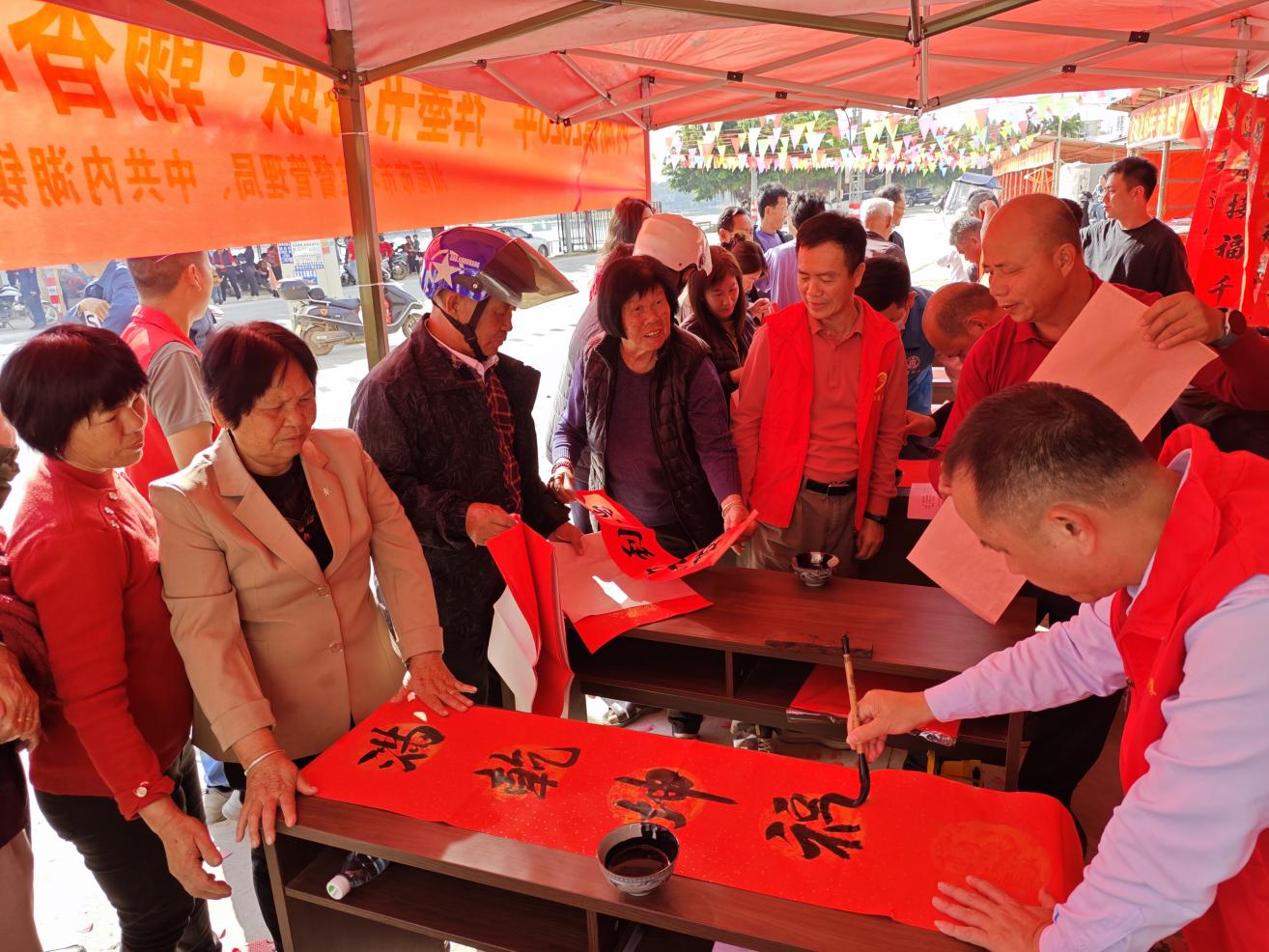 舞狮表演结束后,书法送福环节正式开启。为确保活动顺利开展、让村民都能领到心仪的春联,活动主办方提前谋划、精心筹备,邀请了多位资深书法老师参与活动,老师们更是提前一日凝神构思、挥毫泼墨,精心书写了一批寓意吉祥、对仗工整的春联,涵盖了平安喜乐、五谷丰登、阖家幸福、事业兴旺等美好主题,提前为活动做好了充足准备。
