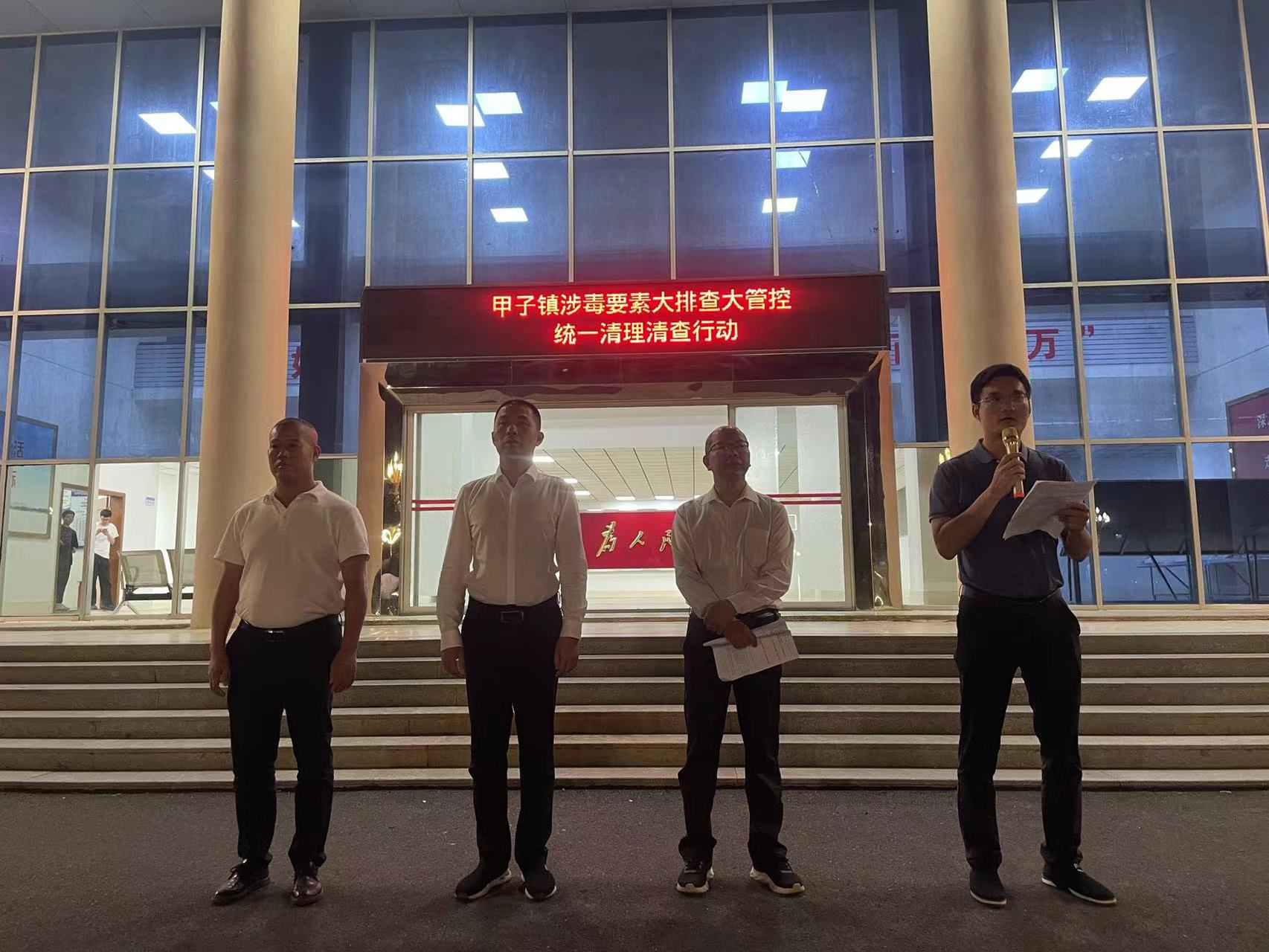 为进一步挤压涉毒活动空问,巩固禁毒成果,结合我镇禁毒示范创建及“10.18”专项行动部署,严厉打击涉毒违法犯罪活动,严防制毒活动复发,营造全民禁毒的浓烈氛围,坚决维护甲子镇社会治安大局平安稳定。镇党委、政府决定于今晚组织甲子镇全体干部职工、派出所所有警力、村(社区)两委干部、挂职民警及网格联防大队共 425 人,在甲子镇辖区范围内集中力量、重点突击,开展涉毒要素大排查大管控统一清理清查行动。