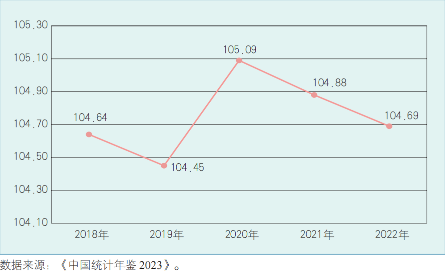 比例反映的是构成一个总体的部分与部分之间的基本关系,或者两个总体之间倍差的关系。描述比例关系的变化可以说明部分与部分之间协调性的问题。例如,2022年末中国大陆总人口中男性人口72206万人,女性人口68969万人,以女性人口为100,总人口的男女比例就为:104.69:100,如图2。