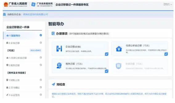 输入主体信息后,进入智能导办页面。企业迁移登记业务必须办理,住房公积金迁移、税务迁移、社保迁移等企业迁移事项为可选项,可根据实际情况选择需要办理的事项。