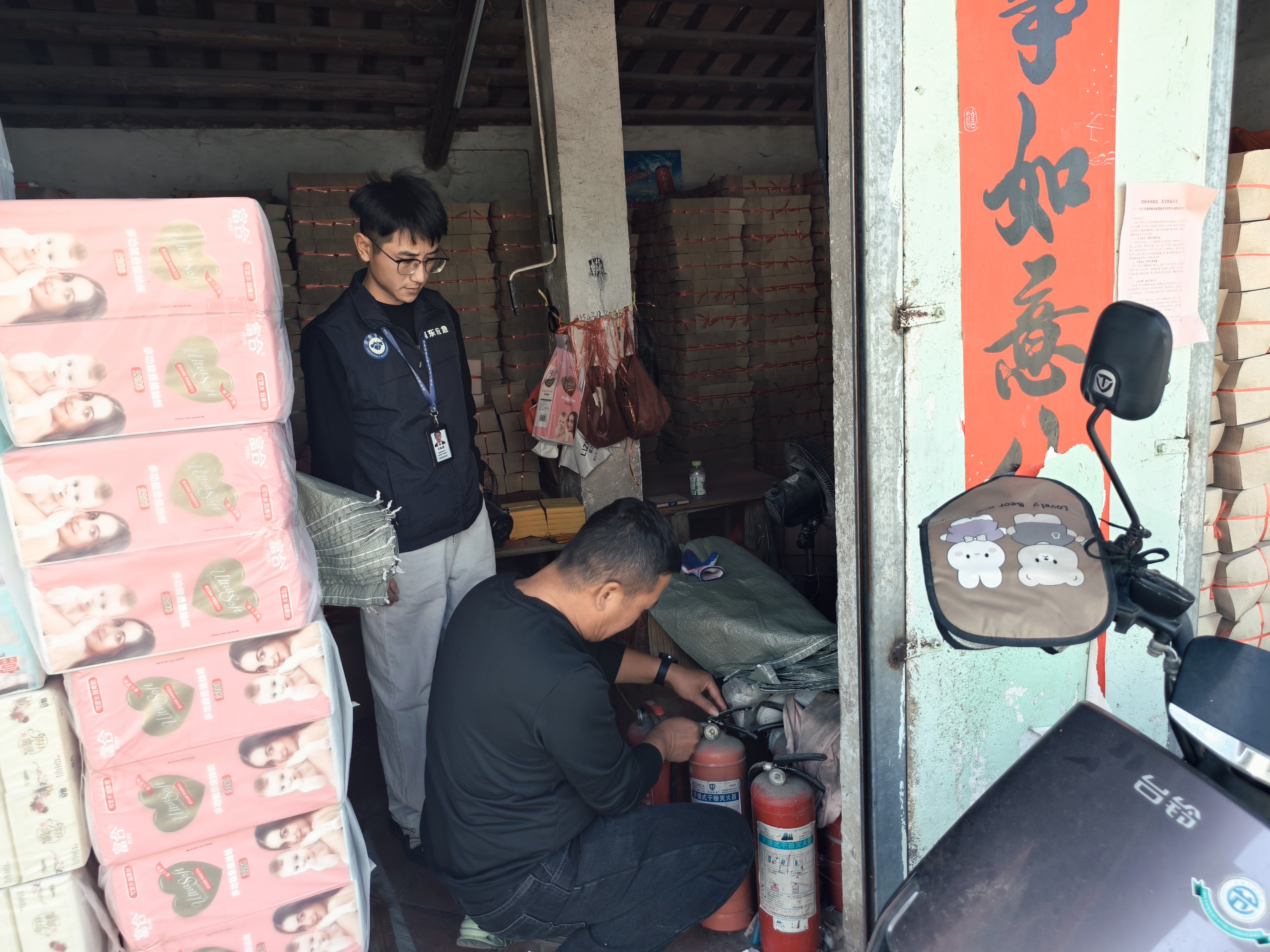 检查过程中排查人员对重点疏散指示标志、应急照明灯、灭火器是否配置齐全且保持完好有效,安全出口是否畅通,电器线路敷设是否符合消防技术标准,卖场与生活区是否分离,是否存在私拉电气线路等方面进行了细致的检查,现场对工作人员进行提问消防常识、逃生自救知识等。检查结束后,排查人员对负责人提出要求:要认真开展消防安全自查工作,及时更换过期灭火器,严格落实各项消防安全措施,自觉整改火灾隐患,日常工作生活中要规范用电、用火安全,严禁占用、堵塞疏散通道和安全出口,要时刻保持畅通,加强对工作人员的消防安全知识培训,提高员工扑救初起火灾、引导疏散人员的能力。