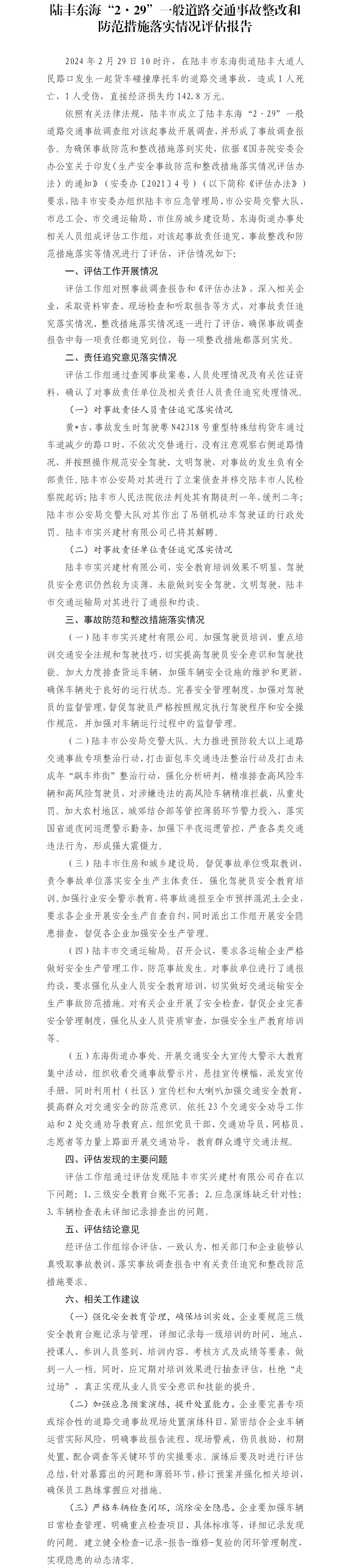 陆丰东海“2·29”一般道路交通事故整改和防范措施落实情况评估报告