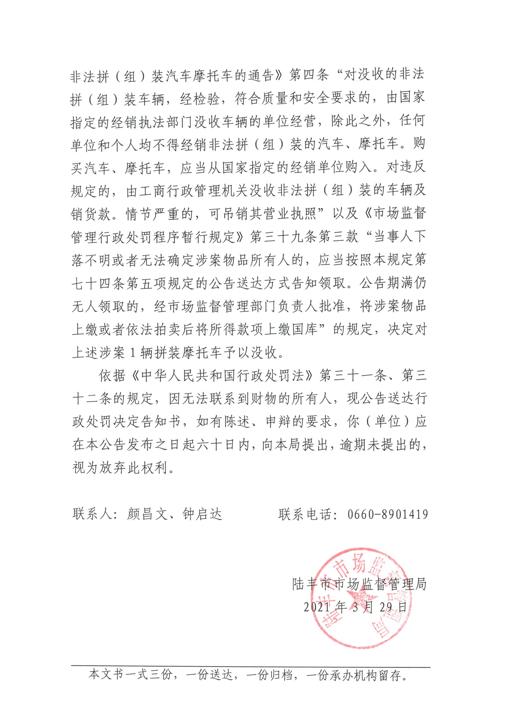 陆丰市市场监督管理局无人认领财物行政处罚决定告知公告