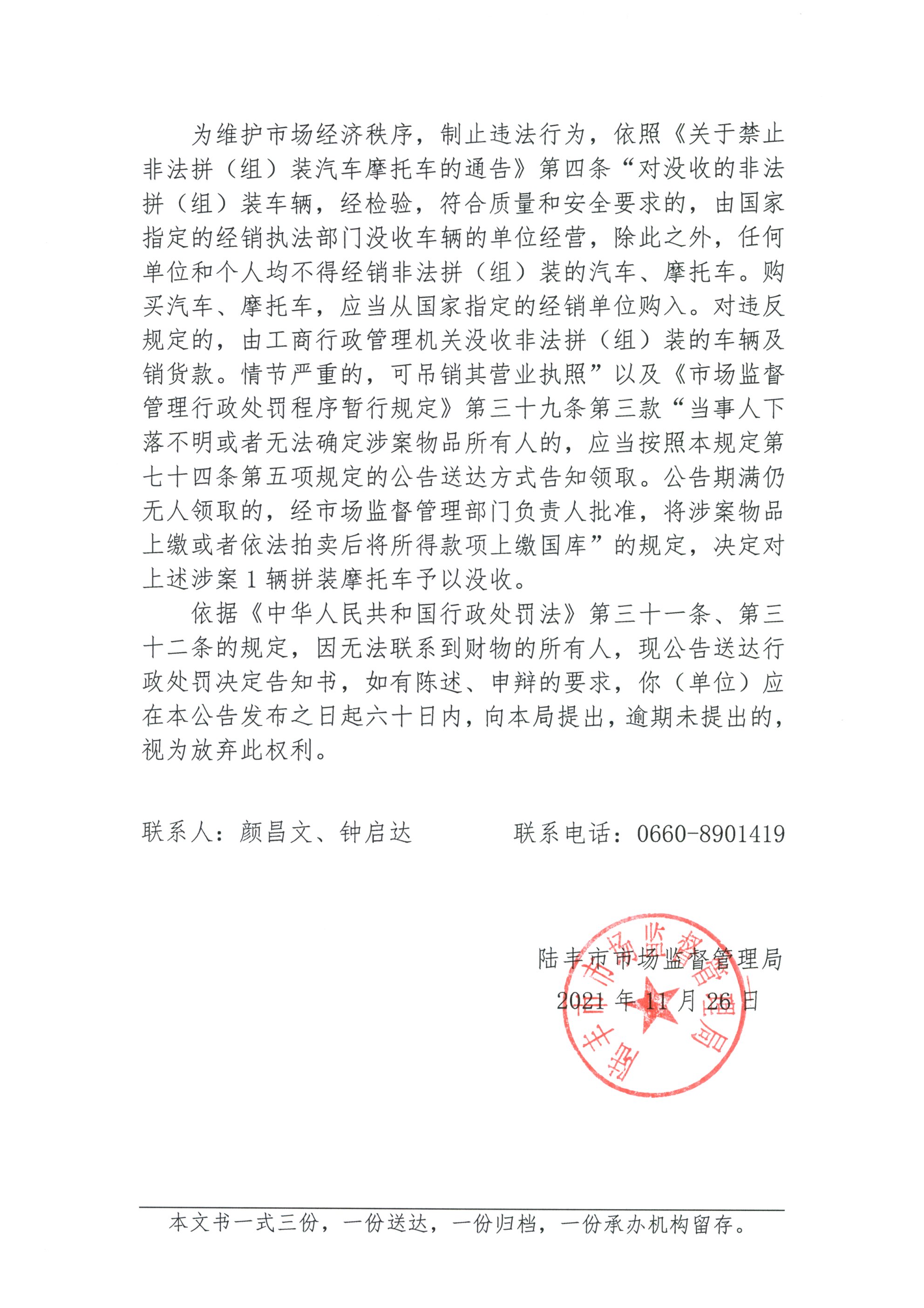 陆丰市市场监督管理局无人认领财物行政处罚决定告知公告