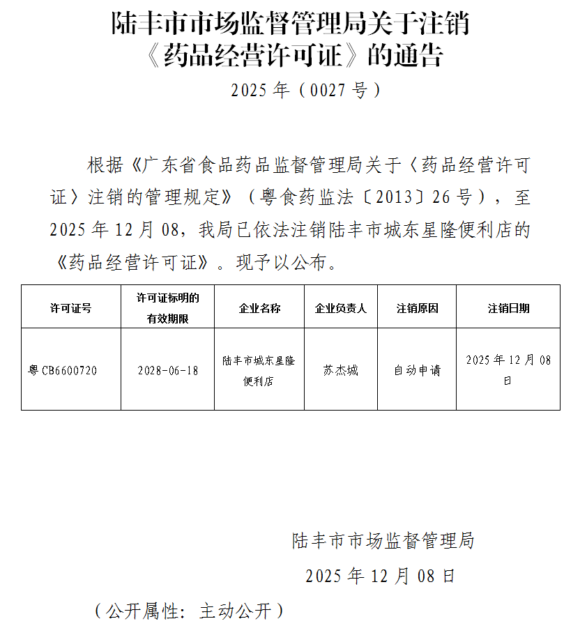 陆丰市市场监督管理局关于注销《药品经营许可证》的通告