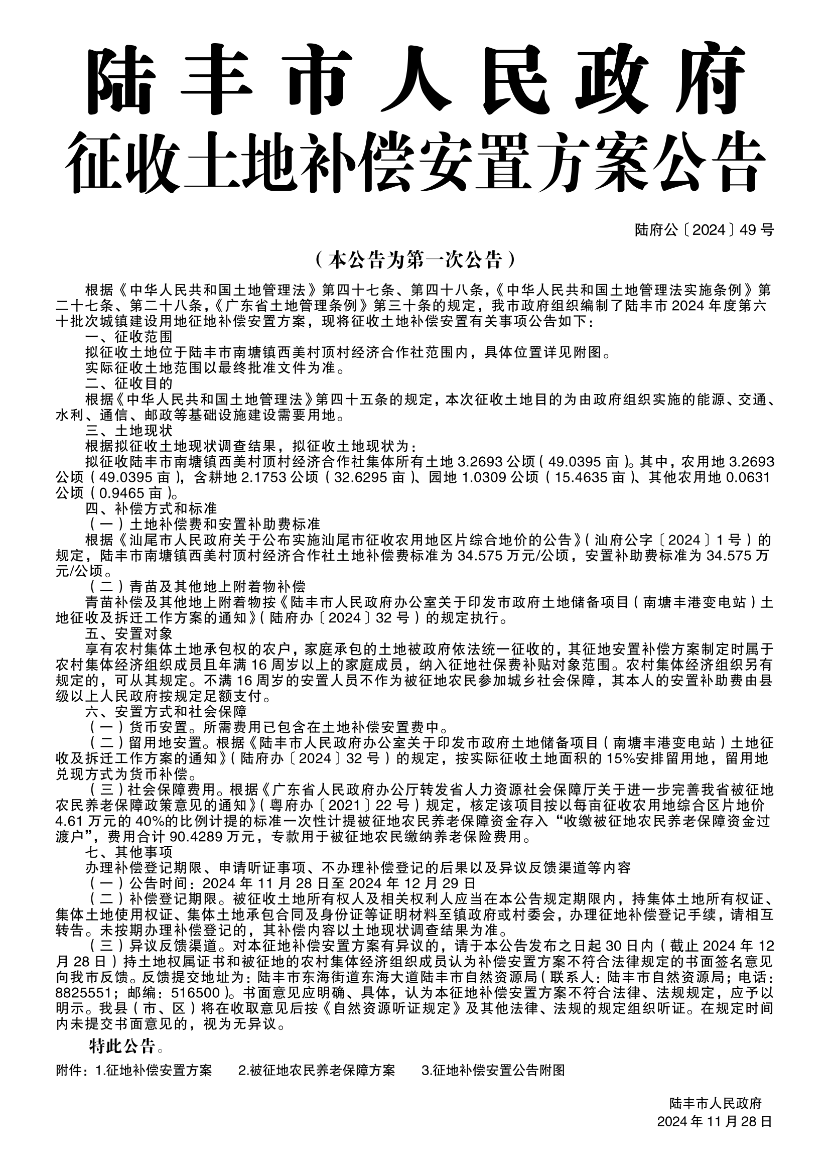 陆丰市人民政府关于征收土地补偿安置方案的公告(陆府公〔2024〕49号)