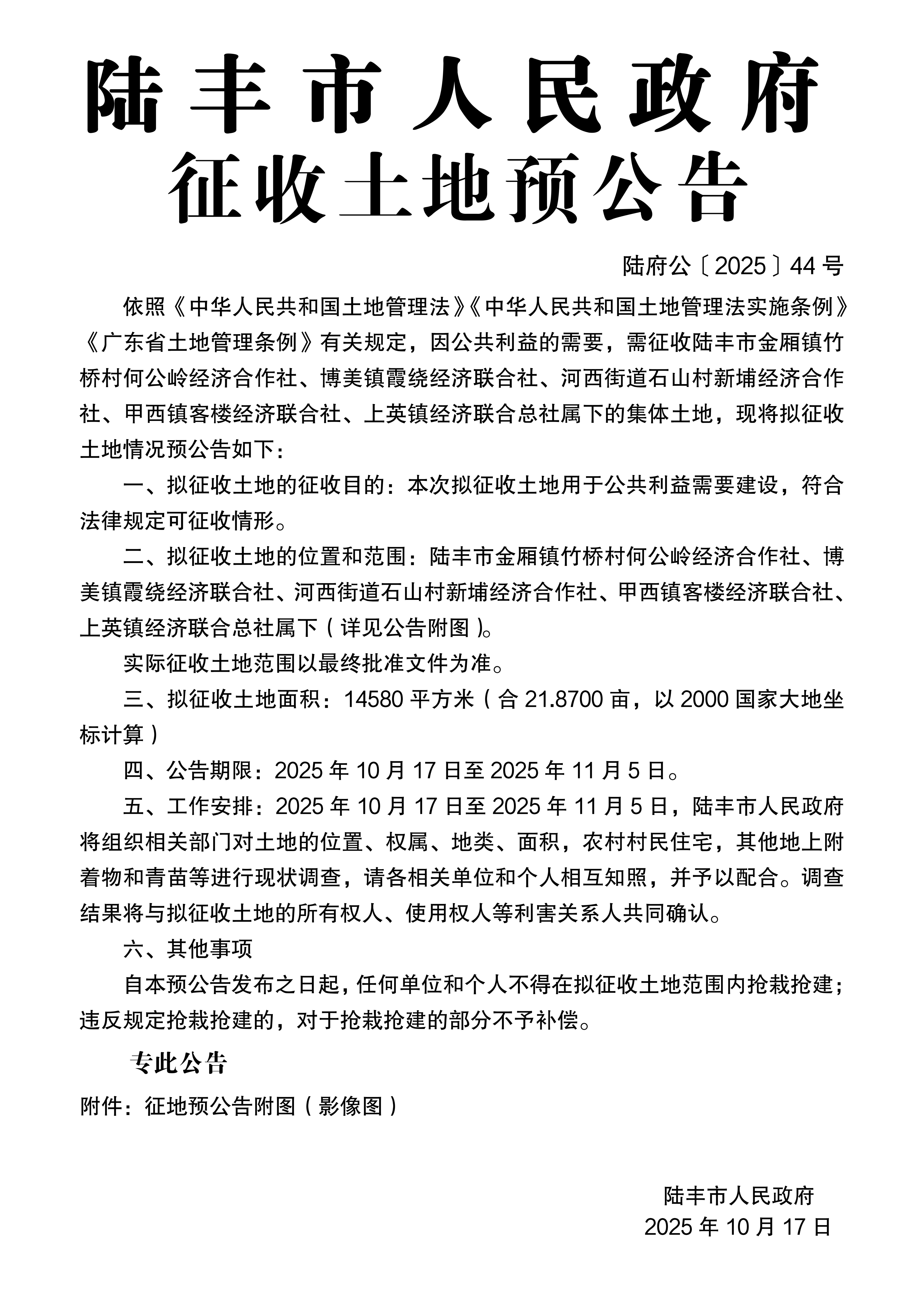 陆丰市人民政府关于征收土地预公告(陆府公〔2025〕44号)