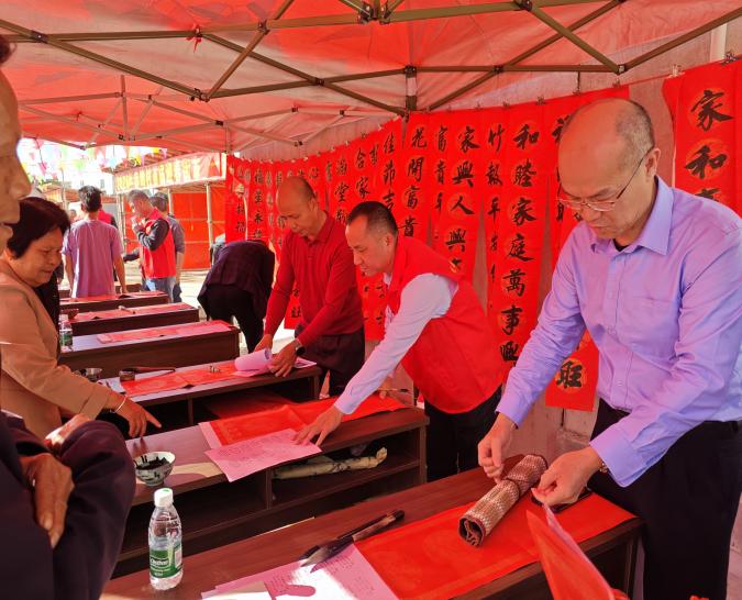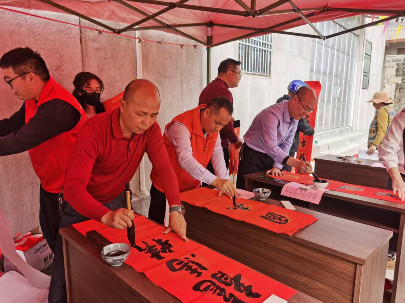 舞狮表演结束后,书法送福环节正式开启。为确保活动顺利开展、让村民都能领到心仪的春联,活动主办方提前谋划、精心筹备,邀请了多位资深书法老师参与活动,老师们更是提前一日凝神构思、挥毫泼墨,精心书写了一批寓意吉祥、对仗工整的春联,涵盖了平安喜乐、五谷丰登、阖家幸福、事业兴旺等美好主题,提前为活动做好了充足准备。