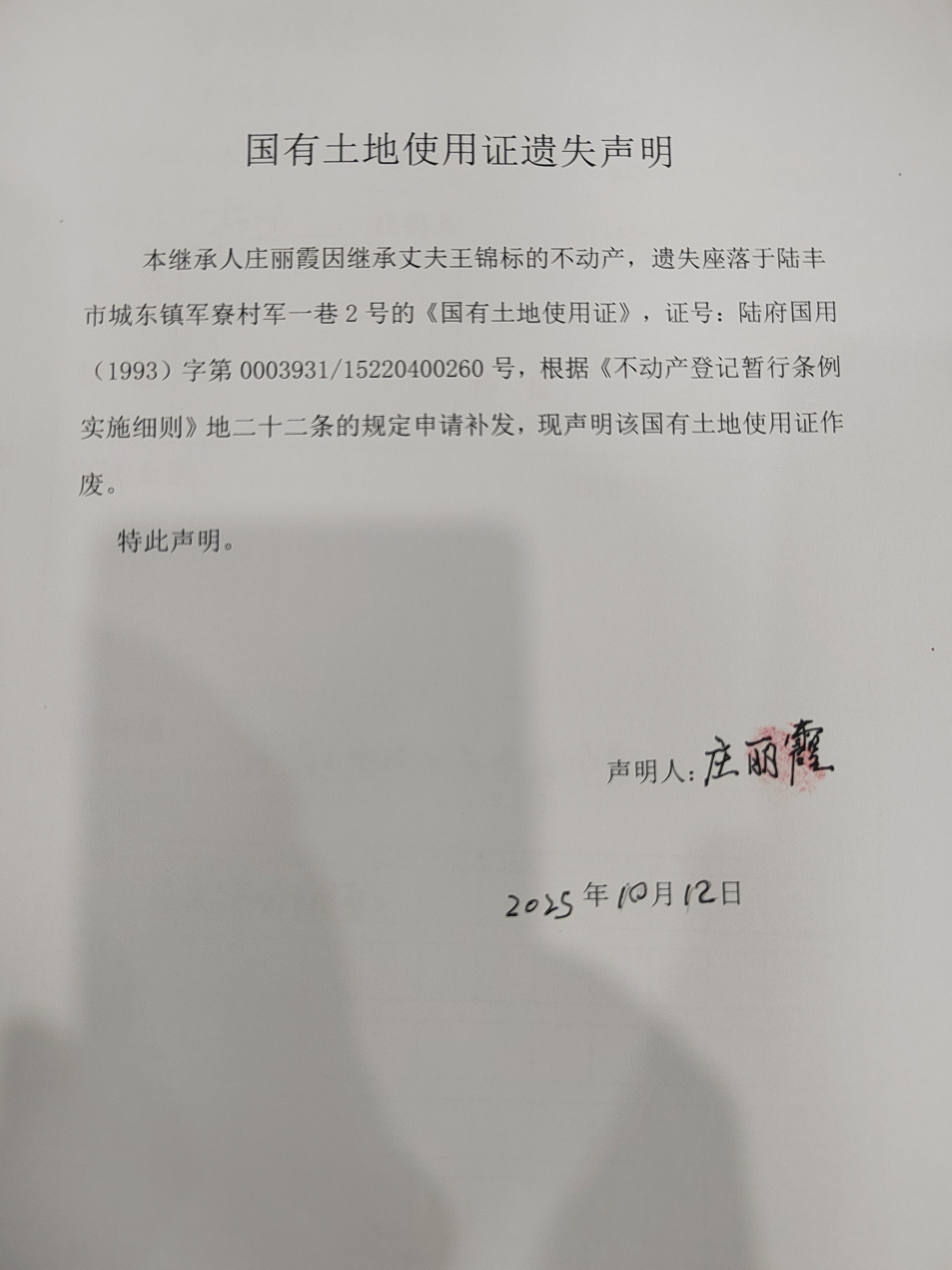 遗失声明:本继承人庄丽霞因继承丈夫王锦标的不动产,遗失座落于陆丰市城东镇军寮村军一巷2号的《国有土地使用证》,证号:陆府国用(1993)字第0003931/15220400260号,根据《不动产登记暂行条例实施细则》地二十二条的规定申请补发,现声明该《国有土地使用证》作废。