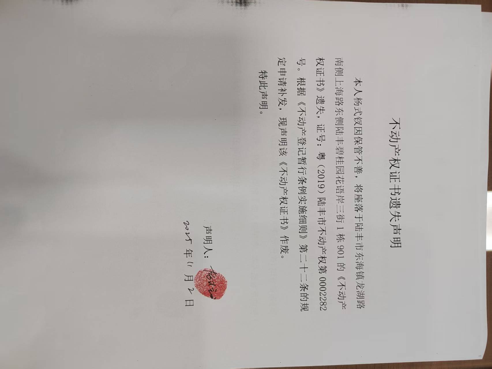 遗失声明:本人杨式钗因由于保管不善,将座落于陆丰市东海镇龙湖路南侧上海路东侧陆丰碧桂园花语岸三街1栋901的《不动产权证书》遗失,证号:粤(2019)陆丰市不动产权第0002282号。根据《不动产登记暂行条例实施细则》第二十二条的规定申请补发,现声明该《不动产权证书》作废。