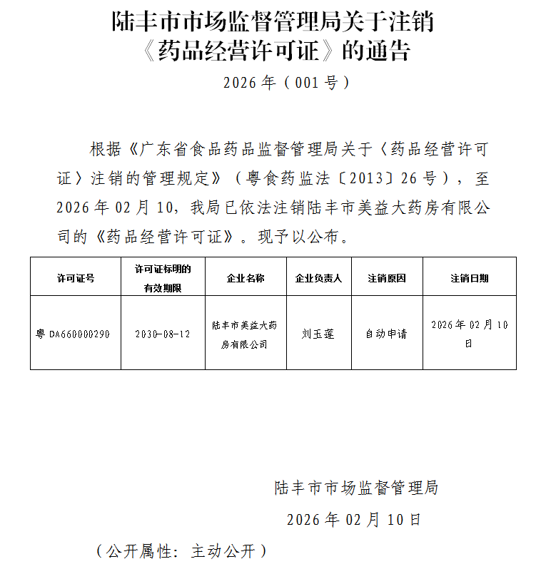 陆丰市市场监督管理局关于注销《药品经营许可证》的通告