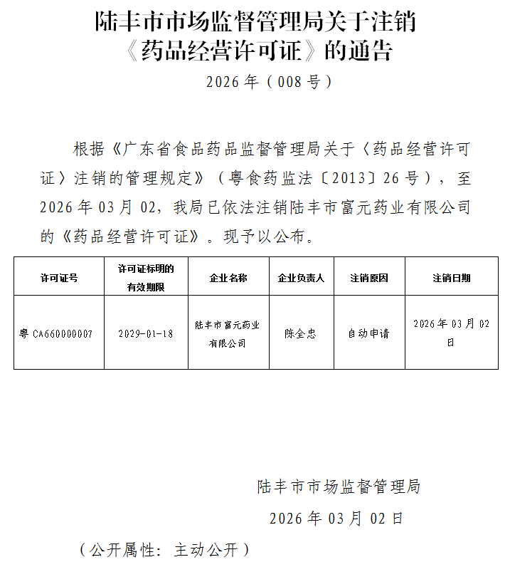 陆丰市市场监督管理局关于注销《药品经营许可证》的通告