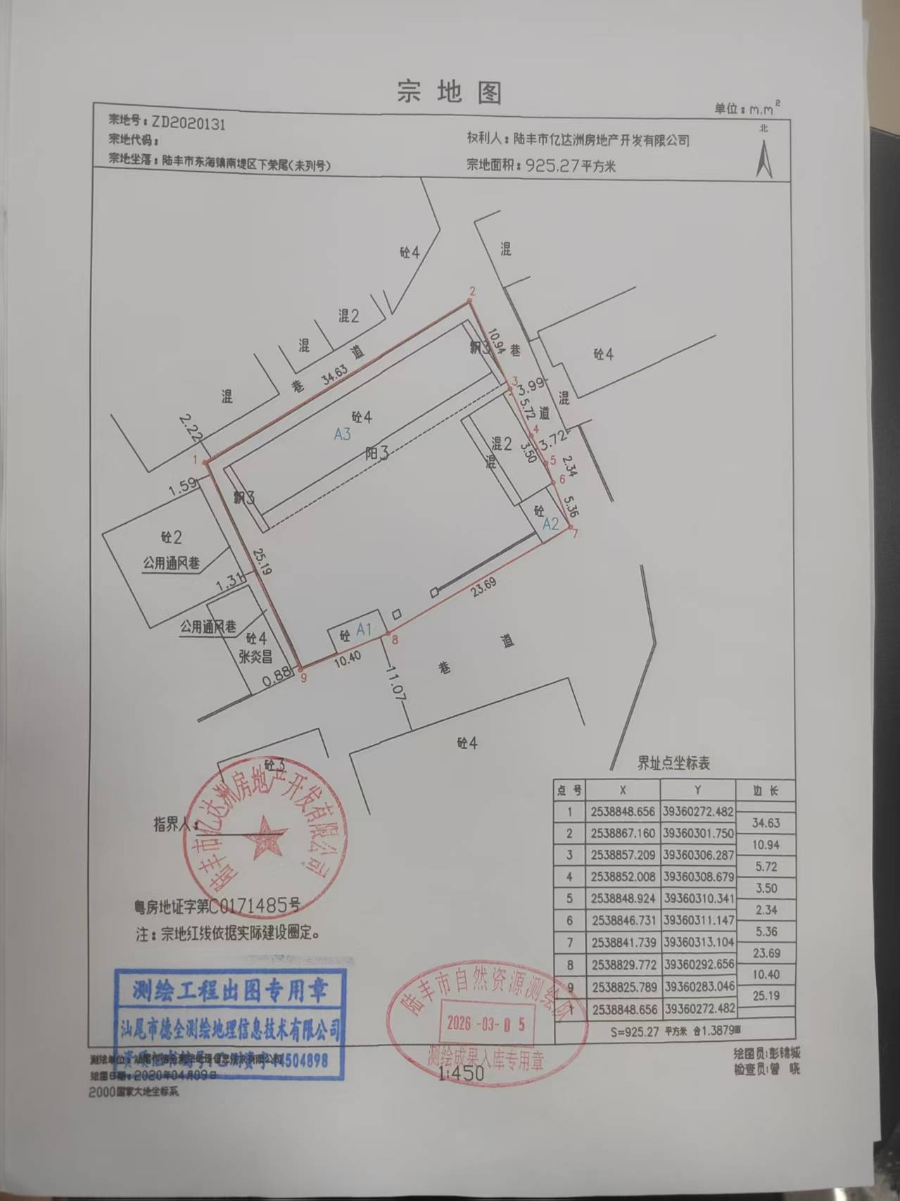陆丰市亿达洲房地产开发有限公司位于陆丰市东海镇南堤区下荣尾(未列号),实测土地面积:925.27平方米,建筑面积:945.11平方米,其四至:东至巷道;西至公留通风巷;南至巷道;北至巷道(以宗地图为准)。