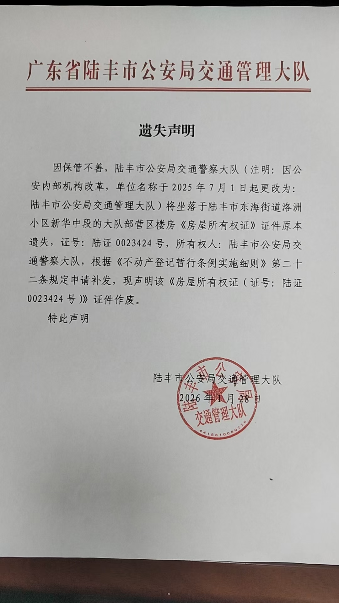 陆丰市公安局交通警察大队因《房屋所有权证》遗失,现向我局申请补发新权属证书,根据《不动产登记暂行条例实施细则》第二十二条的规定,对下列《房屋所有权证》声明作废。