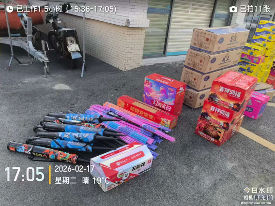 今天下午,镇政府联合镇派出所对银滩摆摊商贩开展突击检查,发现并依法收缴烟花爆竹达 38 件。今晚,镇联合检查组继续发力,收缴违规销售烟花爆竹 1 件。各村(社区)行动则全过程坚持“严排查、细核查、快整改”原则,累计排查九小场所 30 余家,排查发现安全隐患 6 处,分别为灭火器过期 3处、烟感报警器电量不足 2 处以及应急灯未通电 1 处,均属于消防设施功能性隐患。排查人员第一时间向相关责任人告知隐患危害,明确整改标准、整改时限及责任要求,当场下达限期整改通知,督促其尽快完成整改、消除隐患。