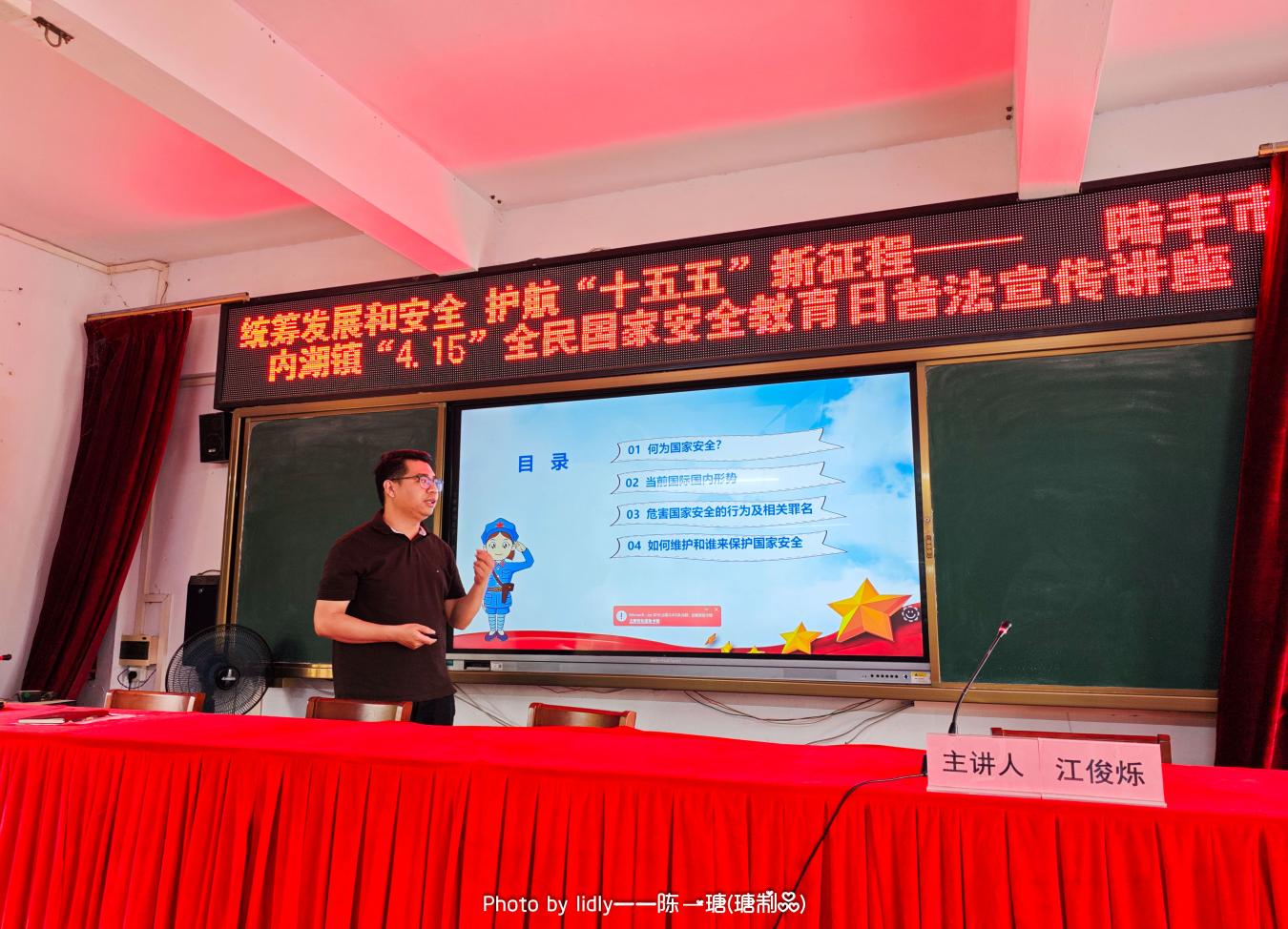 活动特邀广东悦舟律师事务所江俊烁律师为内湖中学师生及各部门代表开展国家安全普法宣传专题讲座。江律师围绕《中华人民共和国国家安全法》《反间谍法》《反恐怖主义法》等法律法规,结合典型案例,深入浅出地阐释了国家安全的丰富内涵、当前面临的风险挑战以及公民维护国家安全的责任和义务。讲座突出“十五五”规划开局起步与国家安全的内在联系,强调统筹发展与安全的极端重要性,引导广大青少年和基层工作者树立底线思维,增强忧患意识,自觉做国家安全的坚定守护者。
