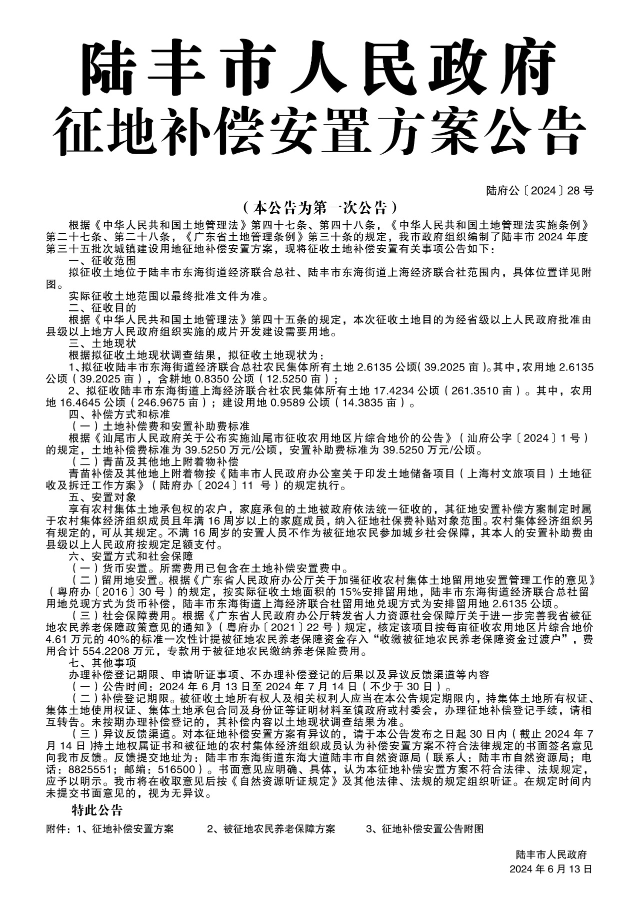 陆丰市人民政府征地补偿安置方案公告
