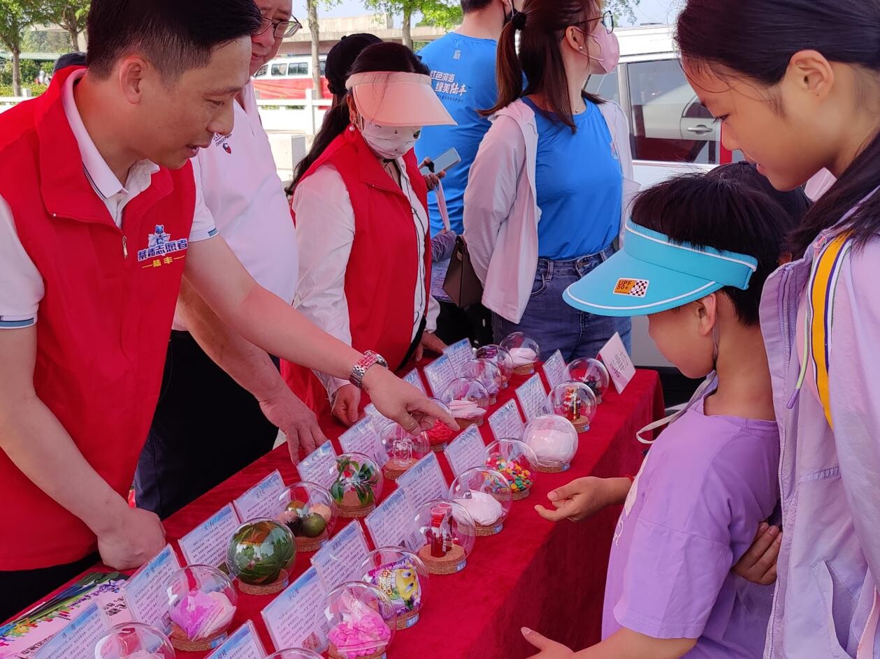 禁毒志愿者们在宣传展位中摆放着各类毒品仿真模型,向徒步活动的参赛者们介绍毒品种类、毒品危害和预防知识,发放禁毒宣传手册几百份,引导参赛者们背贴禁毒标语、带着“禁毒”踏上徒步旅程。