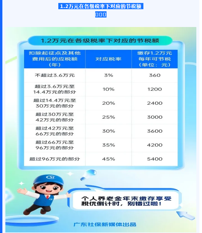 据悉,在年底前完成个人养老金账户缴存的参与者,可在明年3月至6月个人所得税综合所得汇算清缴期间,凭缴存凭证办理个税专项附加扣除。按目前个人所得税超额累进税率计算,每年12000元的缴存额度,最高可为参与者节省约5400元税款,具体节税金额将根据个人实际收入及适用税率而定。