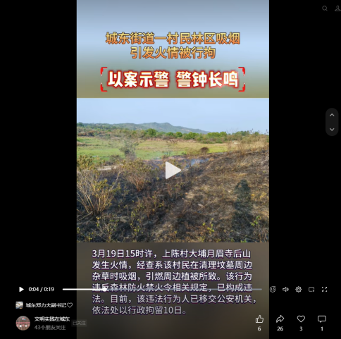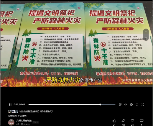 一是网络平台视频宣传,扩大覆盖面:街道借助新媒体力量,在视频号“文明实践在城东”发布森林防火宣传短视频,以生动的形象、通俗易懂的语言讲解森林防灭火知识,提升群众对火灾危害的认知。同时,发布违法警示视频,通过真实案例展示违规用火引发火灾所面临的法律后果,起到强大的警示作用。这一举措有效利用了网络传播的便捷性,吸引了众多群众关注,扩大了宣传覆盖面。