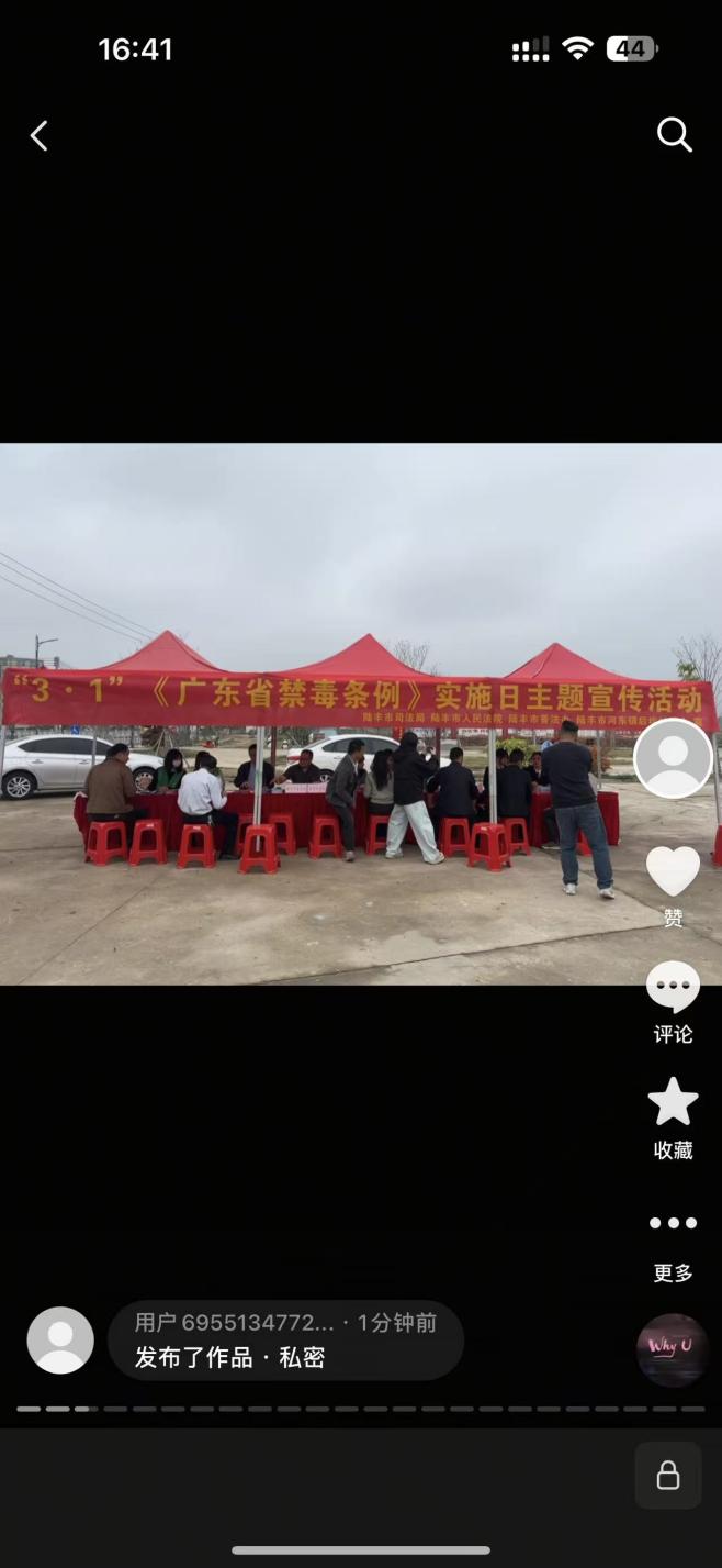 活动中,通过摆摊搭台的形式,向过往群众分发禁毒宣传小册子,鼓励群众积极参与禁毒斗争、工作人员现场讲解《广东省禁毒条例》等有关禁毒相关法律法规呼吁每一位群众自觉从我做起,提高自身的识毒、防毒、拒毒的意识和能力。志愿者向群众宣传详细讲解了毒品预防知识和禁毒法律法规,倡导“健康人生、绿色无毒”文明生活方式,鼓励群众认真学习科学文化知识,平常多学习关注禁毒法律法规,坚决做到自觉拒绝毒品,自觉参与禁毒宣传。同时,发布线上宣传短视频,营造浓厚线上宣传氛围。