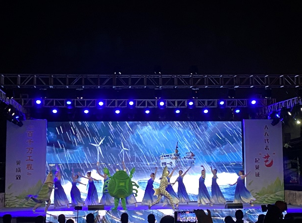 活动现场,村委干部与父老乡亲齐聚一堂共赏演出,现场不时喝彩互动,气氛热烈融洽。活动在市级非遗项目《鲤鱼灯·五岳朝天》中拉开帷幕,灵动的灯影寄托了风调雨顺、五谷丰登的美好愿景。随后,蒙古族舞蹈《红马呈祥》以刚劲舞姿展现了陆丰儿女实干兴农的昂扬风貌。在《指尖光影》环节,更是展示了陆丰皮影戏、木偶戏的独特魅力,彰显了千年文脉在传承中焕发的新生。压轴出场的钱鼓舞儿童剧《寻宝记》,以童真视角创新演绎了“百千万工程”给乡村带来的喜人变化。