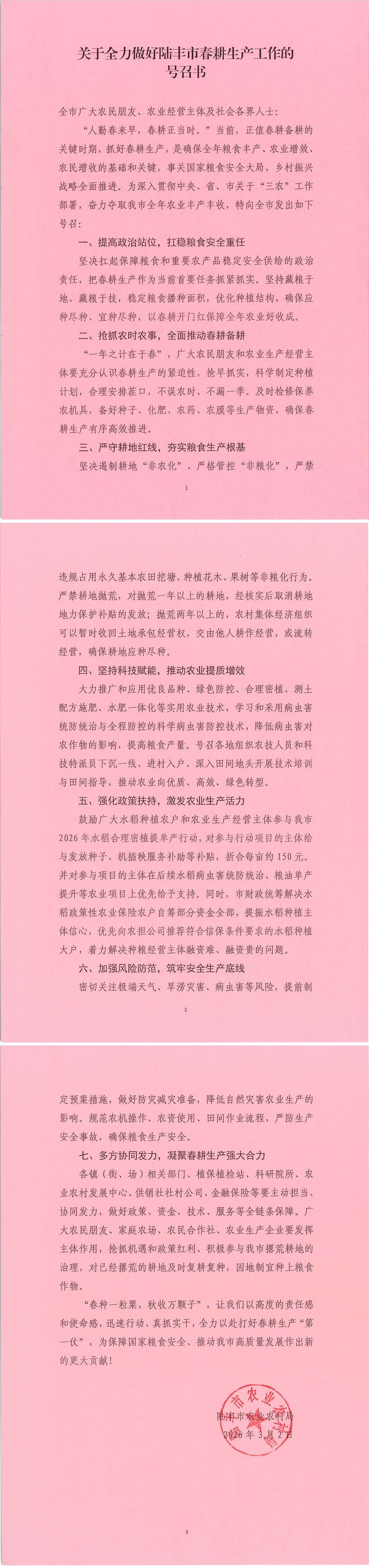 关于全力做好陆丰市春耕生产工作的号召书
